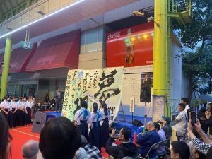 そんな中、旧高島屋の方へ歩いていくと何かの会場が設営されていて、近づくと“第13回書道パフォーマンス大会”と書かれた横断幕が見え、間もなく演技が始まるところでした。毎回ここでやっていたのか、賑わい創出の一環でなのかは分かりませんが、岐阜の高校の書道部18校が参加。どの学校も素晴らしいパフォーマンスを披露していました!