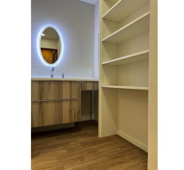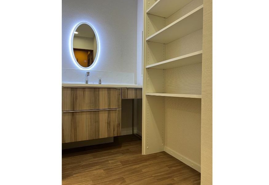 洗面室は以前の収納には全てに扉や引き出しがあり直ぐに取り出せない、開ける引き出すという動作が面倒に感じておられました。そこで今回はオープン収納にすることに。何がどこにあるかが直ぐに分かり、直ぐに手に取ることが出来るテーマは「シンプル」です。